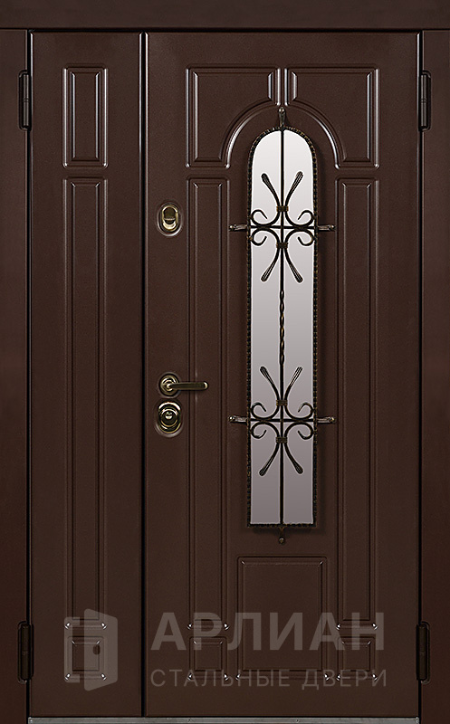 Металлическая двустворчатая дверь со стеклом и кованой решеткой №15