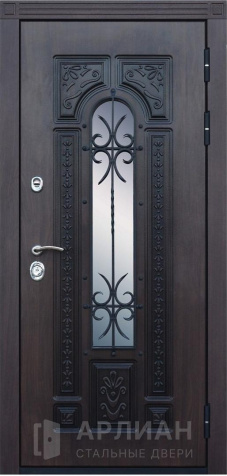 Высокая арочная дверь с фрамугой и кованой решеткой №12